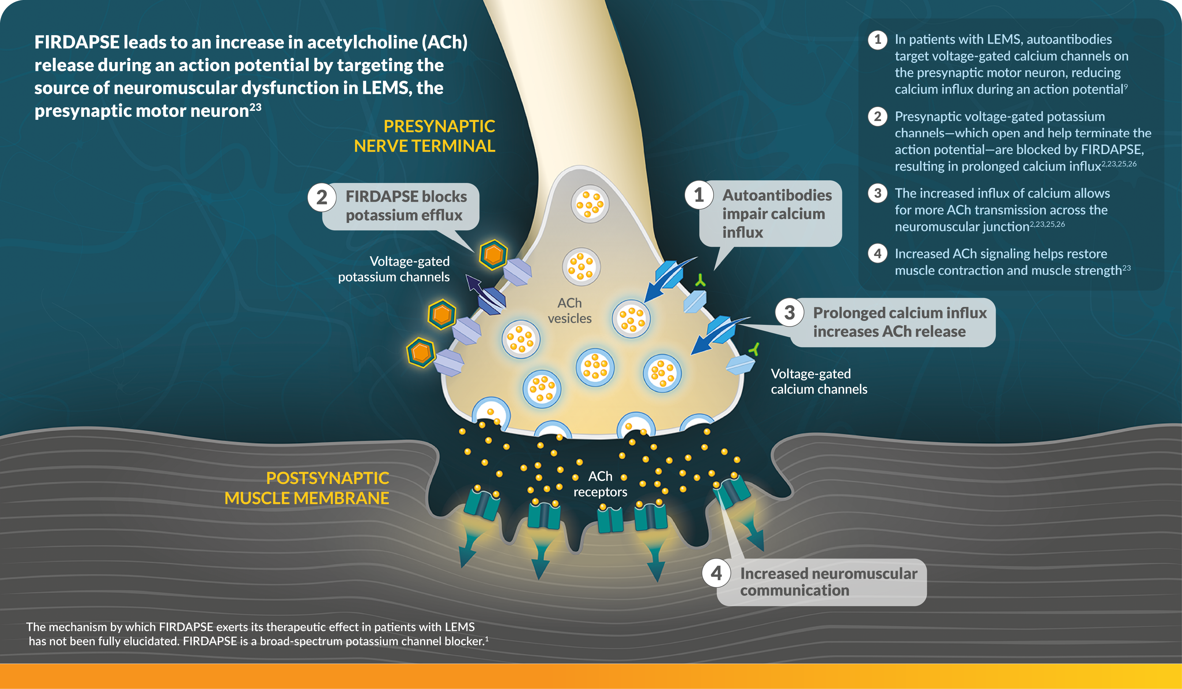 FIRDAPSE works by blocking potassium channels on the presynaptic nerve terminal that cause action potential termination. This results in sustained calcium influx and increased ACh release at the neuromuscular junction.1,2,23,24